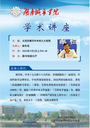 2024年7月2日上午,中共十七大和十八大代表、全国政协第十二届委员、中国档案学会理事长、中央档案馆原馆长、国家档案局原局长杨冬权应邀来我院举行了一场题为“从党史看百年未有之大变局”的党史学习教育报告会。讲座由学校党委书记、联系我院校领导汤放华主持。