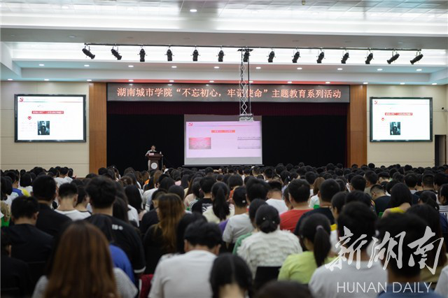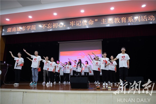 新湖南客户端6月5日讯(通讯员 谢立新 周洁 林俊任)烈火熔铸初心,忠诚引领使命。6月3日晚19:00,一场声势响亮的“不忘初心、牢记使命”红色主题教育活动在湖南城市学院大学生活动中心拉开帷幕。700余名学生党员、入党积极分子齐聚一堂,共同接受了一份来自“初心与使命”的特殊洗礼。活动借助咏诵、党课与合唱等形式,传递出党对一代青年学生党员成长成才的殷切期待,激励他们奋发向上、担当作为、无私奉献,勇做时代的弄潮儿和奋斗者,为广大青年学生树立学习与生活的榜样。