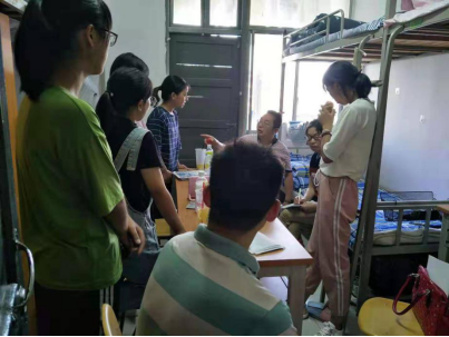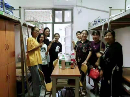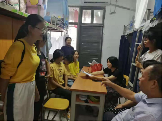 在一栋631寝室里,负责该寝室的高永爱老师与每位同学畅谈他们各自家乡的特色,一下子拉进了与孩子们的距离。楚静老师了解到大家正在为庆国庆70周年歌咏表演估做准备,便兴致所致,当场来了一段,优美的歌声让同学们惊叹不已,掌声雷动,寝室气氛很是热烈。匡列辉博士表示同学们如果有什么专业上的困惑尽管来问他,知无不言,言无不尽。刘凌霄老师问起孩子们生活上的细节,看她们是不是适应了这种集体生活,并嘱咐大家,有什么问题可以通过微信群或者电话随时联系老师。