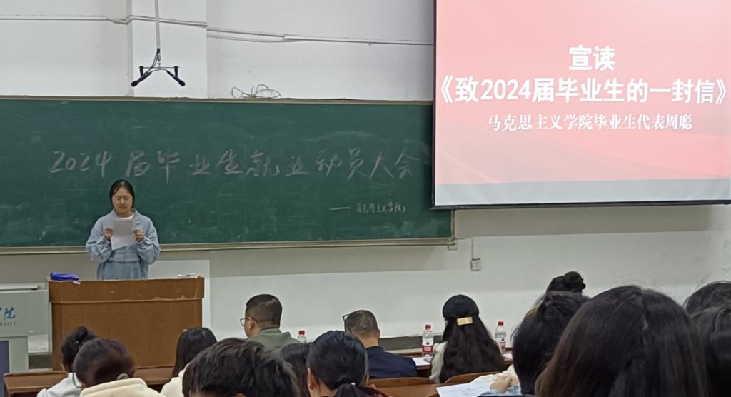 毕业生代表周聪宣读“湖南城市学院招生就业处致2024届毕业生的一封信”,鼓励同学们调整心态,积极参与学院、学校组织的各类就业指导活动,不断提升就业能力。