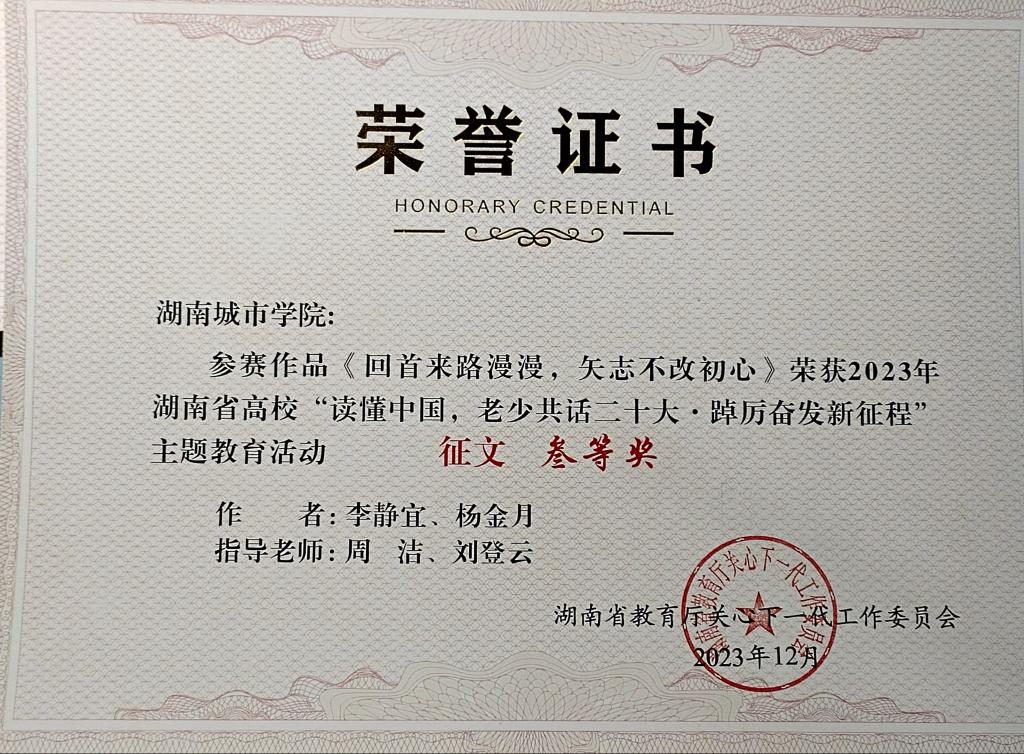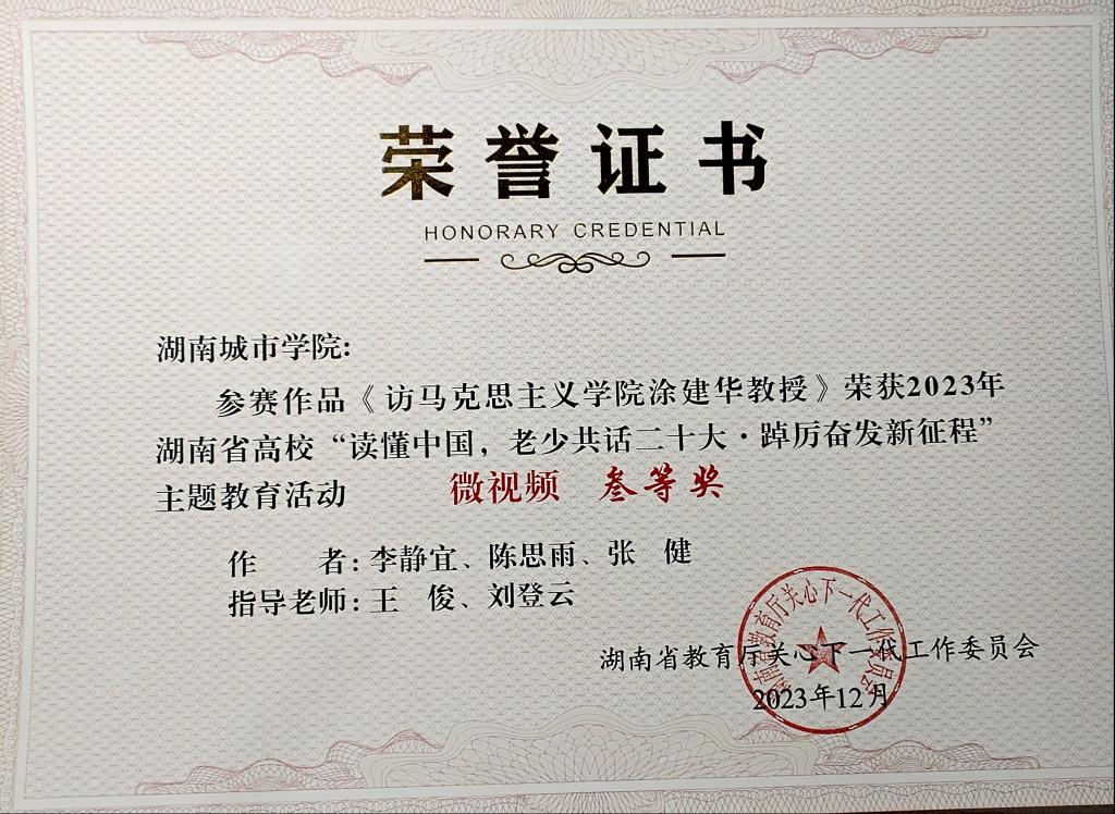 (通讯员 贺明慧)近日,湖南省教育厅关工委召开全省教育系统关工委工作会议,对全省高校“读懂中国,老少共话二十大·踔厉奋发新征程”主题教育活动进行总结表彰。我院共三项作品获奖。
