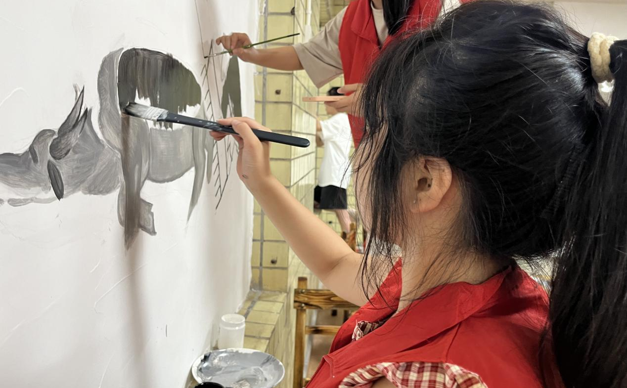 实践团成员在绘制“耕读”文化主题墙绘