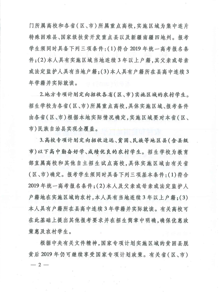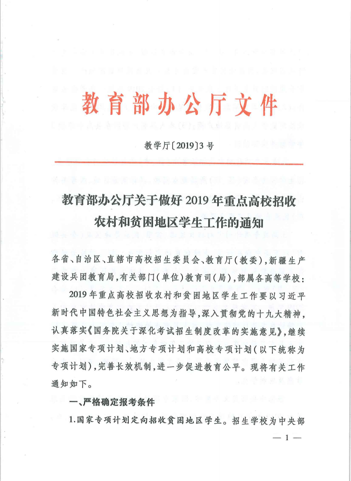 教育部办公厅关于做好2019年重点高校招收农村和贫困地区学生工作的通知